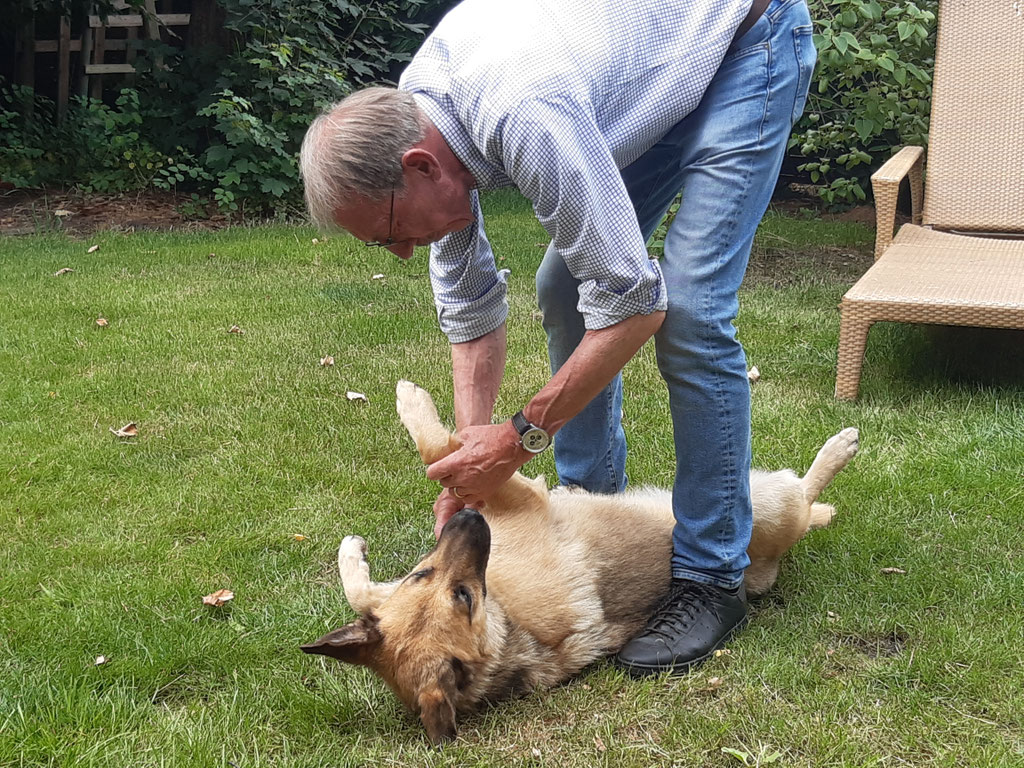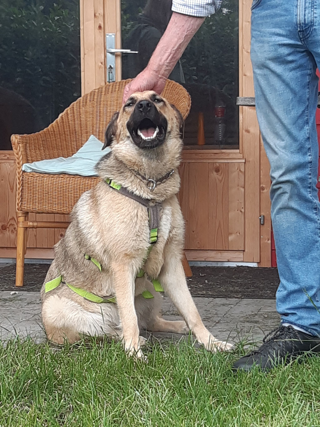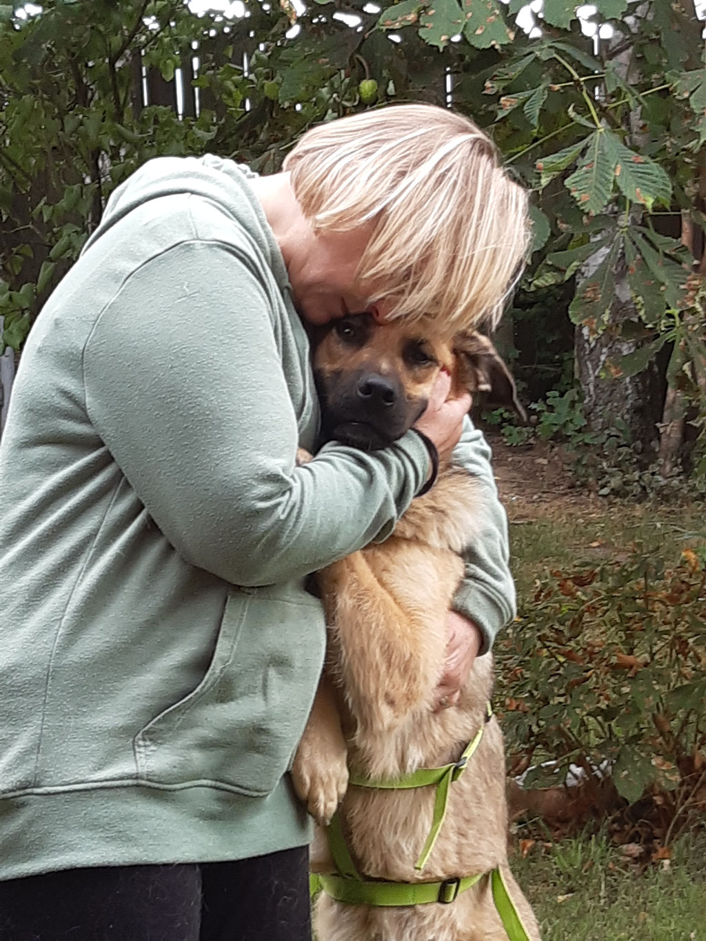 Manchmal ist sie dabei recht aufgeregt, lässt sich aber gut beruhigen, wenn man ruhig mit ihr arbeitet. Sie orientiert sich sehr an ihren Bezugspersonen, sogar draußen unter Ablenkung, und lässt sich an der Schleppleine problemlos abrufen. Auch an der Leine läuft sie bereits gut.